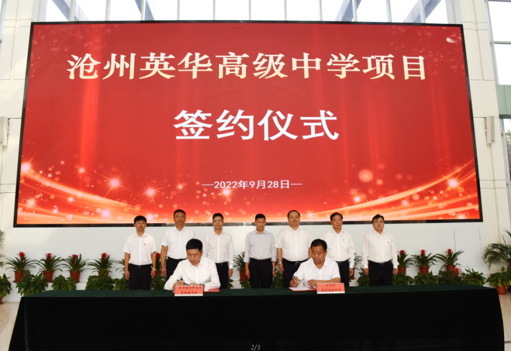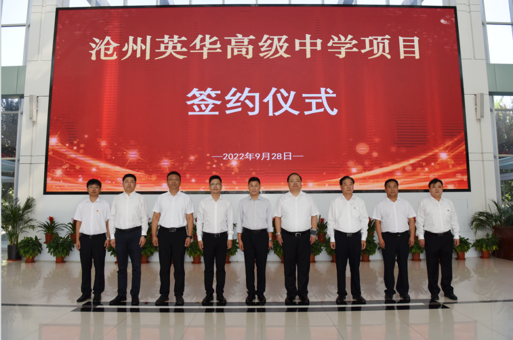 9月28日上午,滄州市經濟開發區管委會隆重舉行滄州英華高級中學項目簽約儀式。滄州市人民政府副市長尹衛江、滄州經濟開發區黨工委書記、管委會主任趙寶良、黨工委委員、副主任蔣福森、李長鑫、投資促進局局長孫博、大元集團黨委書記、董事局主席李建國、大元投資集團副總裁郝書明、大元實業發展集團總裁王俊超、衡水市教育機構校長高輝、河間市英華高級中學校董許紅東等人參加簽約儀式。